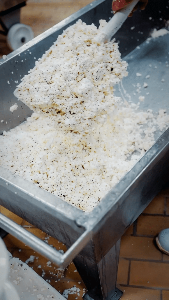 Le tout est ensuité versé dans des moules ronds, prêt à devenir une tomme à l’ail des ours : un fromage au goût franc, frais et végétal, qui sent bon la nature et le savoir-faire auvergnat.